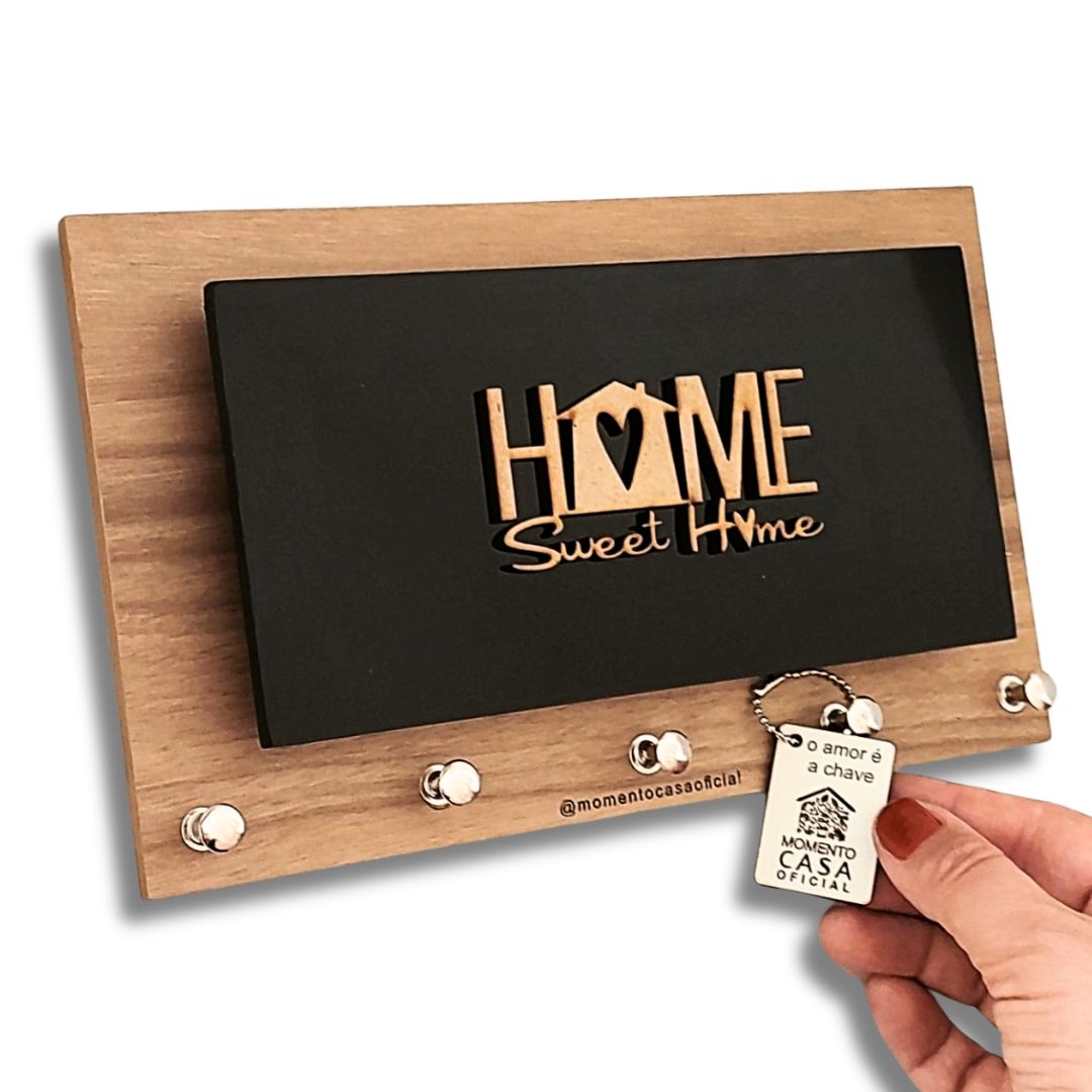 O Momento Casa Oficial, cria produtos exclusivos, atemporais e criativos, feitos com muito amor e carinho para os lares de pessoas especiais como você, desde 2007! Com os nossos porta chaves, você deixa sua casa organizada, decorada, simples e adorável! Feito com MDF. Peça cortada e gravada à laser no tamanho de 25x15x3cm, possui pinos prateados e niquelados para organizar até 5 chaveiros. Possui 2 furos para que possa ser pendurado por parafusos com bucha( o mais indicado). Se sua parede estiver em boas condições, você também poderá fixar a peça com fita dupla face de ótima qualidade (indicamos 3M), respeitando sempre as orientações do fabricante da fita! Itens para pendurar não inclusos!. Cuide da sua peça com carinho, o MDF é delicado e não deve ser exposto a qualquer tipo de umidade ou intempéries.
