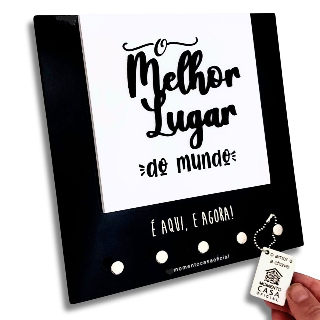 O Momento Casa Oficial, cria produtos exclusivos, atemporais e criativos, feitos com muito amor e carinho para os lares de pessoas especiais como você, desde 2007! Com os nossos porta chaves, você deixa sua casa organizada, decorada, simples e adorável! Feito com MDF. Peça cortada e gravada à laser no tamanho de 20x20x3cm, possui pinos prateados e niquelados para organizar até 5 chaveiros. Possui 2 furos para que possa ser pendurado por parafusos com bucha( o mais indicado). Se sua parede estiver em boas condições, você também poderá fixar a peça com fita dupla face de ótima qualidade (indicamos 3M), respeitando sempre as orientações do fabricante da fita! Itens para pendurar não inclusos!. Cuide da sua peça com carinho, o MDF é delicado e não deve ser exposto a qualquer tipo de umidade ou intempéries.