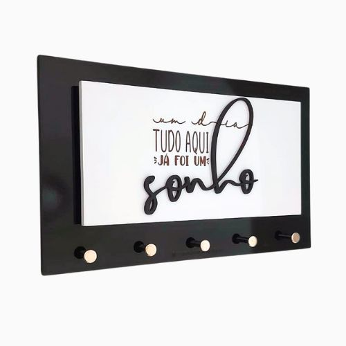 Com acabamento cortado e gravado a laser, mede 25x25x3 cm e traz 5 pinos metálicos prateados, perfeitos para organizar suas chaves com charme e praticidade.